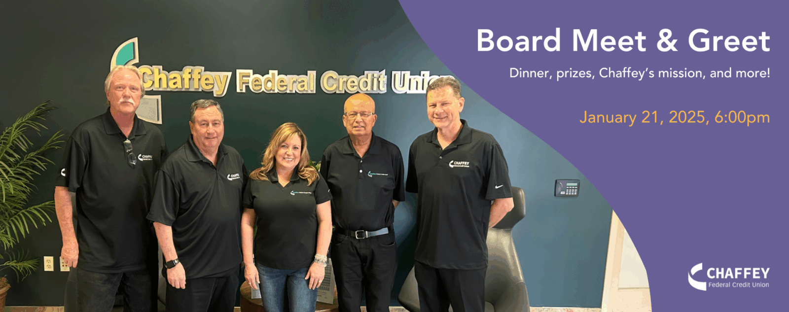 Join us for Chaffey FCU’s first Board Meet & Greet on January 21, 2025, 6:00pm! The Chaffey FCU Board of Directors supports the credit union, oversees Chaffey’s strategic mission, and works to encourage the financial well-being of Members like you. Meet current Chaffey FCU Board Members, enjoy complimentary dinner, and perhaps win a door prize!